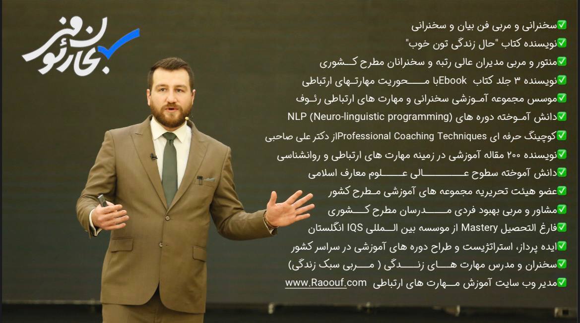 مربی و مدرس سخنرانی،لایف کوچ،نویسنده کتاب «حال زندگیتون خوب»، مدیر مجموعه آموزشی مهارت های ارتباطی رئوف